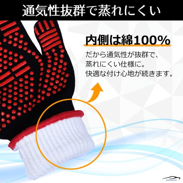 内部の手に触れる部分は綿100%を使用していますので通気性が良く夏場や長時間の作業でも快適に使えます。ゴム製品のような手にまとわりつく不快感はありません。
