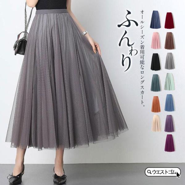 チュールスカート ロング スカート レディース フレア ウエストゴム マキシスカート ミモレ丈 パニエ 裏地あり 黒 秋冬 春夏 映画 ドラマ使用
