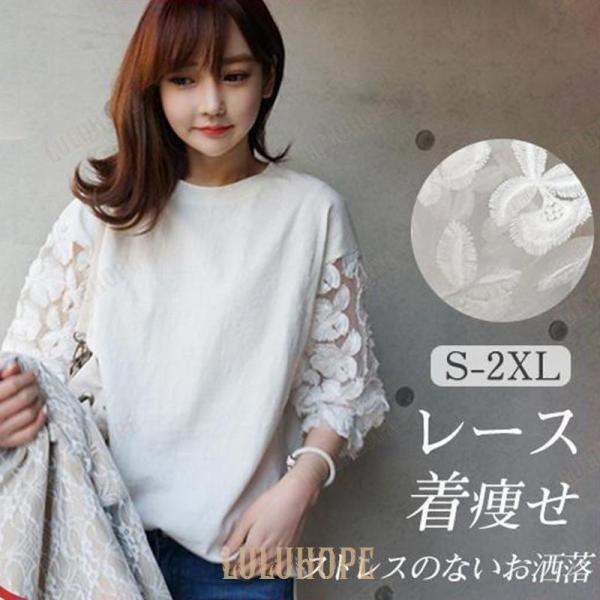 tシャツ 七分袖 レース スラブコットン 切り替え シースルー 無地 レディース 春夏 カットソー トップス ブラウス 薄手 白