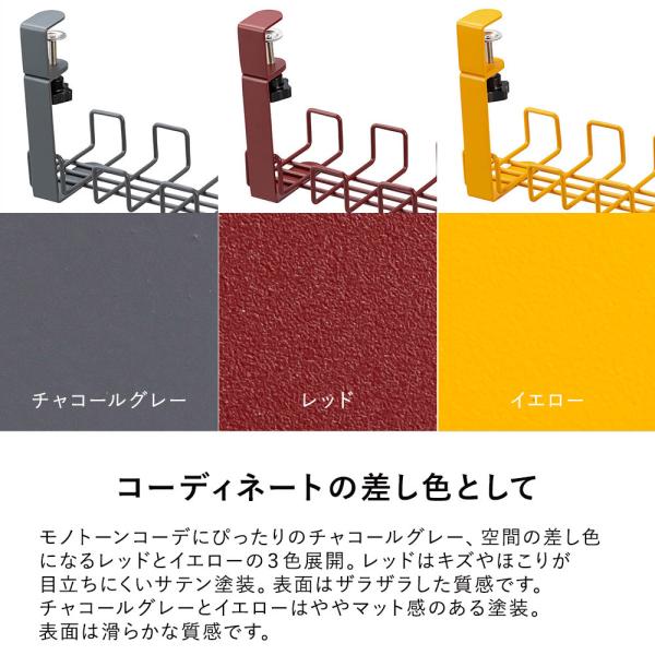 アクセントになるカラーが嬉しい配線トレー。使い方次第で、デスク周りをおしゃれに演出。トレー部分はメッシュ形状で中身が見やすくホコリが溜まりにくい!約5mmの太いワイヤーなので頑丈な点もおすすめなポイントです。【対応商品コード】チャコールグレー:434664 レッド:434665 イエロー:434666