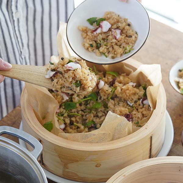蓋を二層の竹の網代編みにすることで、余分な蒸気を程よく逃しつつ、蒸気でやさしく食材を包み込み、じわじわと火を通してくれます。