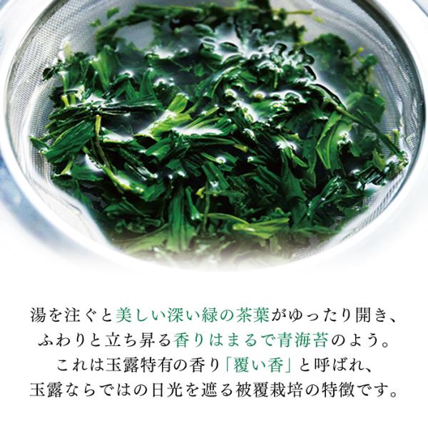 お湯を注ぐとふわり立ち昇る香りはまるで青のりを想わせる玉露特有の香りが広がります。