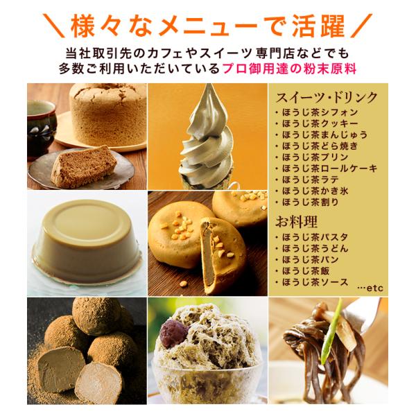 香ばしいほうじ茶の風味は、お料理やお菓子作り、パン作り、麺づくりなどにも最適です。