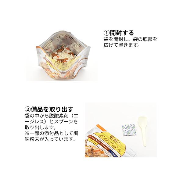 アルファ米は国産のうるち米だけを使用したアルファ化米の防災食で、4種の野菜とスパイスのさわやかな香りのドライカレーです。