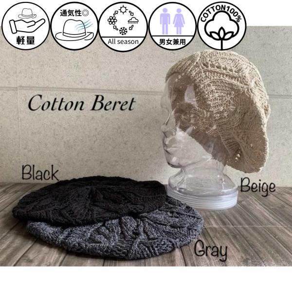 3色展開 帽子 サマー ニット ベレー帽 ざっくり編み コットン100% 春 夏 メンズ レディース 男女兼用 ゆったり 定番 綿 【店内商品2点以上ご購入で送料無料】