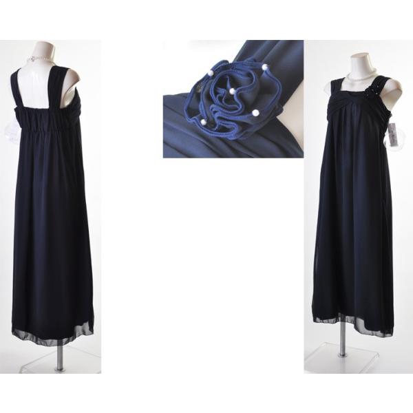 ロング丈ドレスの色はネイビー(茄子紺)で、シフォン素材。