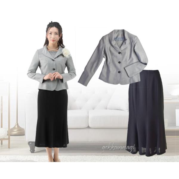 グレーのジャケットと黒ロングスカートスーツ。