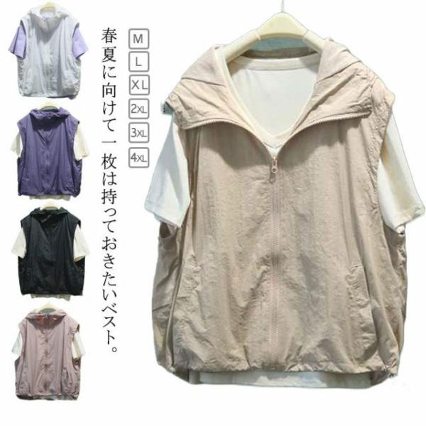 薄手 ベスト 無地 ジレ ノースリーブ パーカー スポーツベスト 羽織り レイヤード ジャケット 前開き 夏 重ね着 アウター レディース ライトアウ