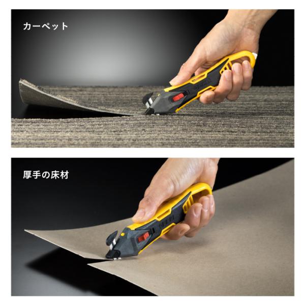 刃の先端が露出しておらず、対象物をすくって切断するため、荷物の中身や下地を傷つけにくくなっています。