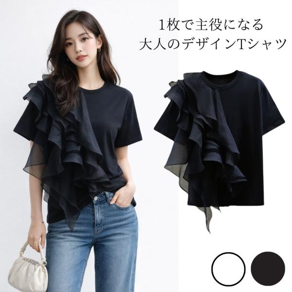 トップス レデイース 半袖 夏 春 Tシャツ tシャツ フリル 夏服 デザインtシャツ 女性 無地 シンプル 可愛い ゆったり かわいい おしゃれ きれいめ 大人