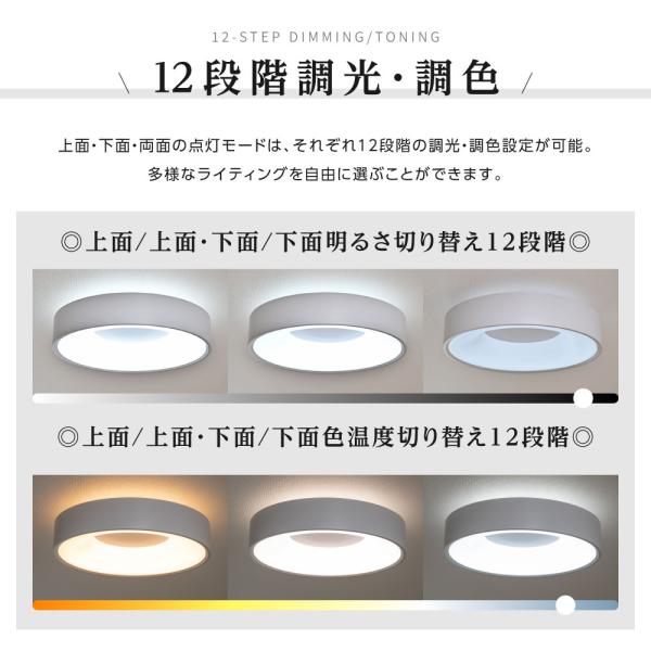 【12段階調光・調色】12段階の調光・調色は自由なライティングが可能です。裏面発光により浮遊感のある間接照明の上品な印象を与えます。リモコンで光の色と明るさを変えられるから、暮らしのシーンやお部屋に合わせて手軽にあかりの切り替えが出来ます。