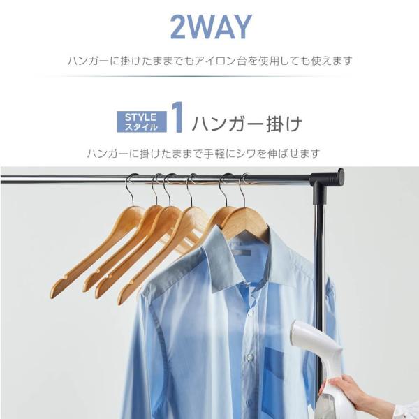 【アイロン・スチーマー両用】衣類スチーマーとして、ハンガーにかけたまま、サッとシワ伸ばします。水漏れ防止のデザインでアイロンのようにプレス仕上げも可能です。20秒スピード立ち上がり、朝忙しい出かけ前に最適です。