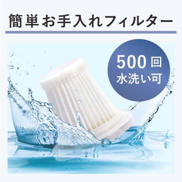 フィルターは 繰り返し使用 & 水洗い 500回まで可能。いつも清潔に保てます。ホコリや花粉などの細かいゴミをキャッチして逃しません。