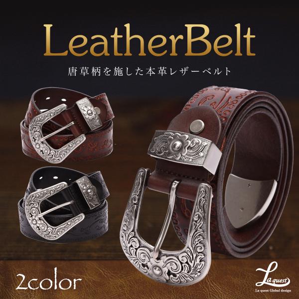 ベルト メンズ 本革 牛革 カジュアル バックル ブランド 金具 レザー Laquest カービング柄 花 唐草型押し ウエスタン