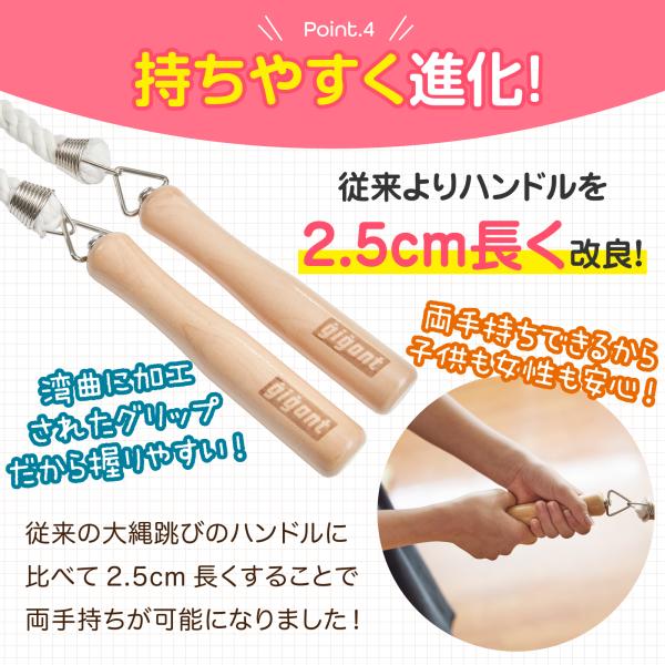 お子さまでもフィットしやすく握りやすくなっておりますので大縄跳びを楽しむ事ができます。
