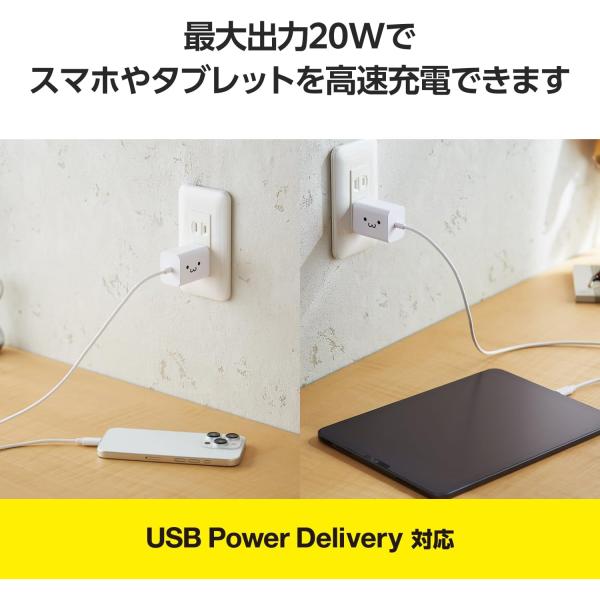 USB Power Deliveryに対応したUSB Type-C(TM)プラグを搭載し、対応するスマートフォン、タブレットなどを充電できるUSB AC充電器です。