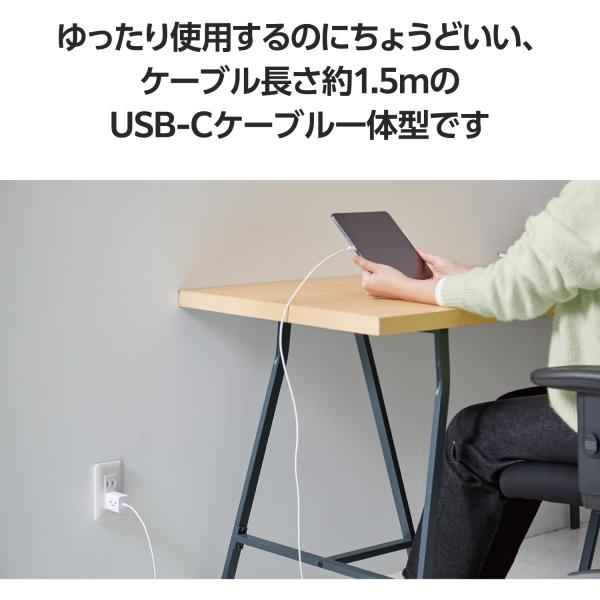 〜ケーブル一体型で、USB Type-C(TM)ポート搭載のスマートフォン、タブレットなどをすぐに充電できるUSB AC充電器です。ケーブルの長さは約1.5mで、取り回しがしやすいです。〜