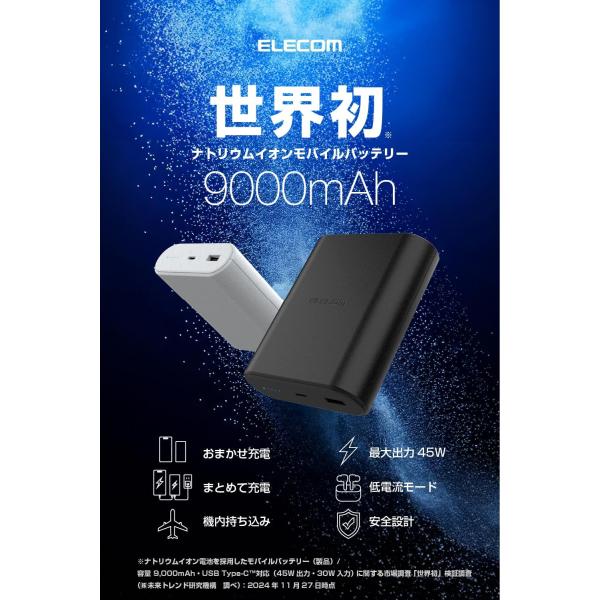 エレコム モバイルバッテリー 9000mAh 45W ナトリウムイオン電池 USB PD対応 2ポート Type-C USB-A PPS対応 ブラック DE-C55L-9000BK
