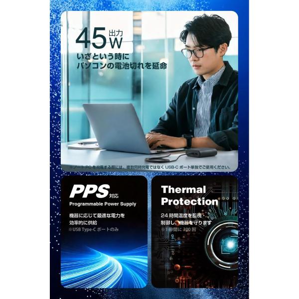 ● USB Power Delivery規格、PPS規格に対応。機器に応じて電圧、電流が変化するため、iPhoneなどのスマートフォンやiPadなどのタブレット、ノートパソコンまで幅広く充電できます。