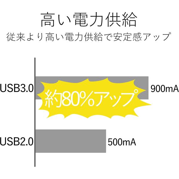 ●給電電流がUSB2.0に比べて80%向上し、複数の機器をつないでも安定した動作が可能です。