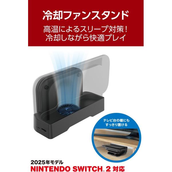 〜NINTENDO SWITCH(TM) 2 をドックごと冷却し、テレビモード中の機器本体の発熱を抑える冷却ファンスタンドです。スタンドは置きたい場所に合わせて、縦置き、横置き(4段階角度調節)が選べて、テレビ台の棚にもすっきり収まります。〜