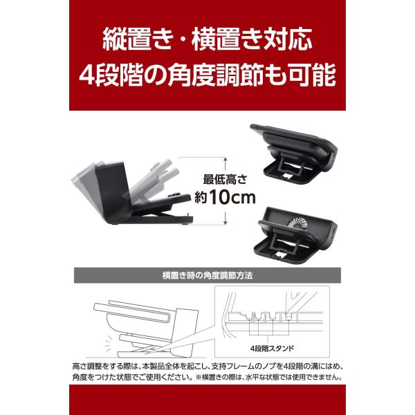 ●縦置き、横置き(4段階角度調節)が可能。横置きは、最低高さ約10cmでテレビ台の棚にもすっきり収まります。※横置きの際は、水平状態では使用できません。必ず角度を付けた状態でご使用ください。