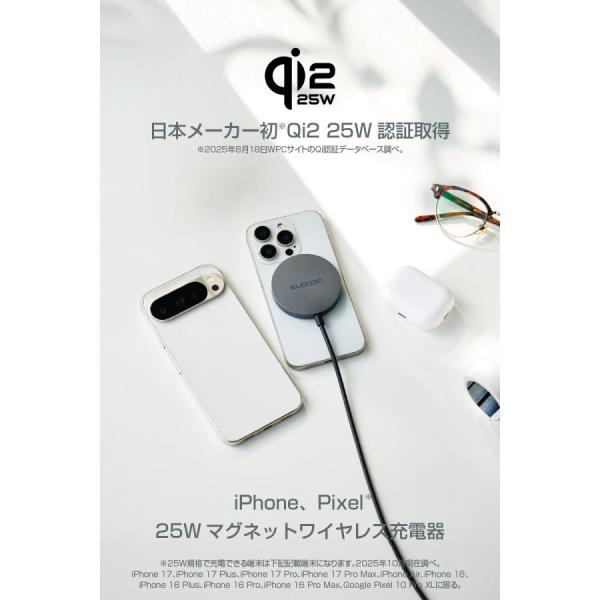 エレコム マグネット Qi2規格対応 ワイヤレス 充電器 最大25W出力 卓上 1m 発熱を抑えた高速充電 ブラック W-MA12BK