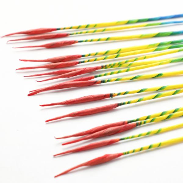 線香花火は非常に繊細で、職人の縒り方、火薬の量、気象条件で一つ一つ違う表情を見せます。筒井時正玩具花火製造所は職人の育成にも力を入れ、バラつきのない美しい線香花火づくりを心がけています。当店では東と西、2つの線香花火をセットにしてご提供致します。それぞれの違いをお楽しみください。