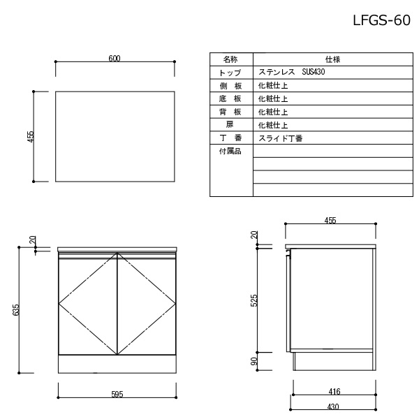 【近畿限定販売】家庭用セクショナルキッチン LFシリーズ ライフ ガス台 コンロ台 奥行455mm 化粧仕上げ スライド丁番 ホワイト LFGS-60-W/srm
