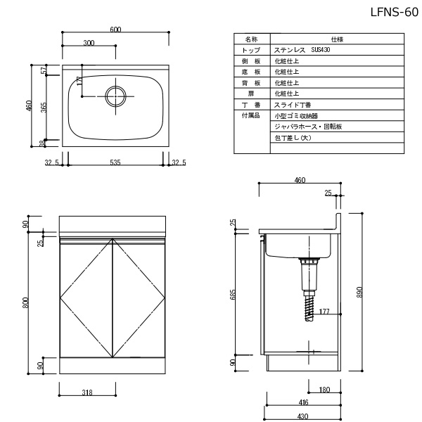 【近畿限定販売】家庭用セクショナルキッチン LFシリーズ ライフ 流し台 奥行460mm ホワイト LFNS-60-W/srm