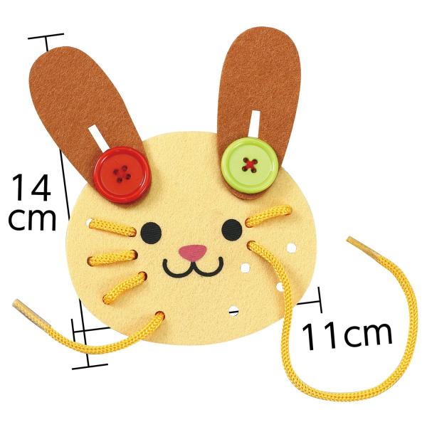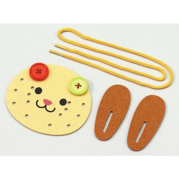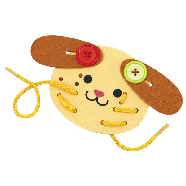 ひも通しとボタン遊びで指先のトレーニング!耳の角度でかわいい犬にも!●商品サイズ:完成サイズ:140×110×2mm、重量:9g、材質:フェルト:ポリエステル ヒモ:ナイロン