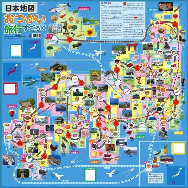 【日本おつかい旅行すごろく】2人~4人で遊べるすごろくです。日本全国をまわって名物を手に入れていきます。遊んでいるだけで都道府県の場所や名物を覚えます。47都道府県の名物がカードになっています。