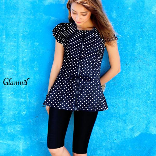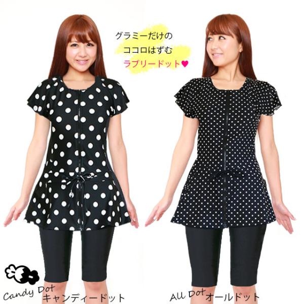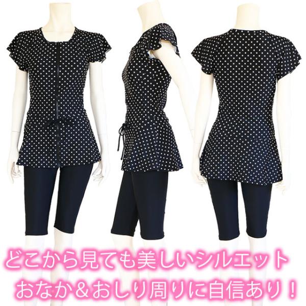 フィットネス水着 レディース 大きいサイズ 体型カバー 水着 セパレート ドット柄 ブラック 5L 4L 3L LL L Mロング丈 2点セット 半袖 袖付き メール便 送料無料