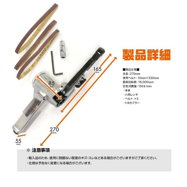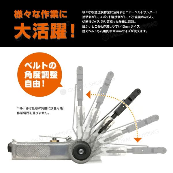 エアベルトサンダー 10mm 替えベルト付き 角度調整機能付 バリ取り サビ取り スポット溶接剥がし 塗装剥がし エアーベルトサンダー