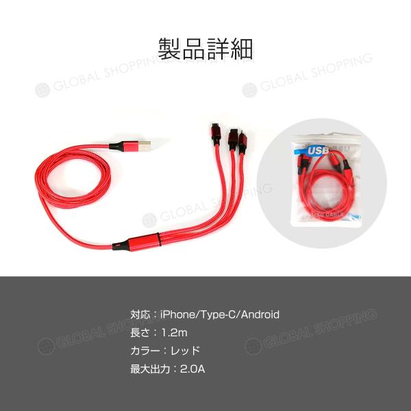 iOS Micro USB Type-C 3in1 充電ケーブル 3台同時充電 1.2m スマホ Android iphone タイプc ipad タブレット usbケーブル