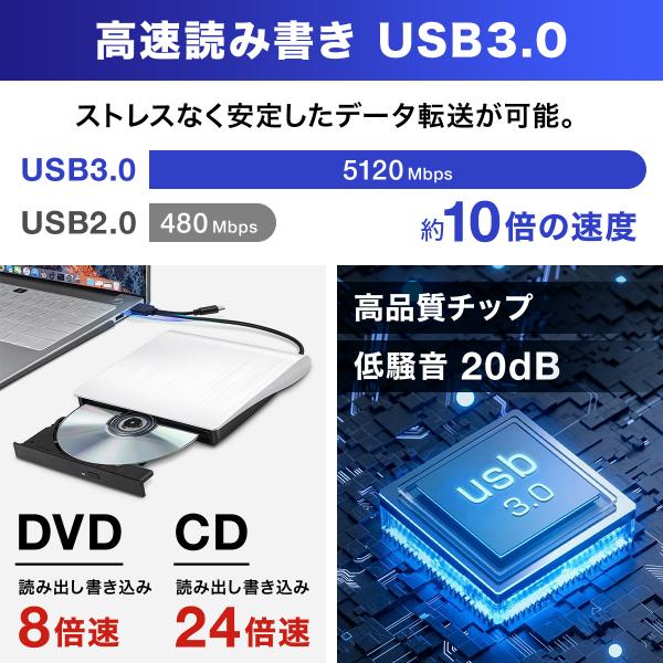 外付けdvdドライブ最新のusb3.0を搭載し、最大5gbpsのデータ転送速度を実現。