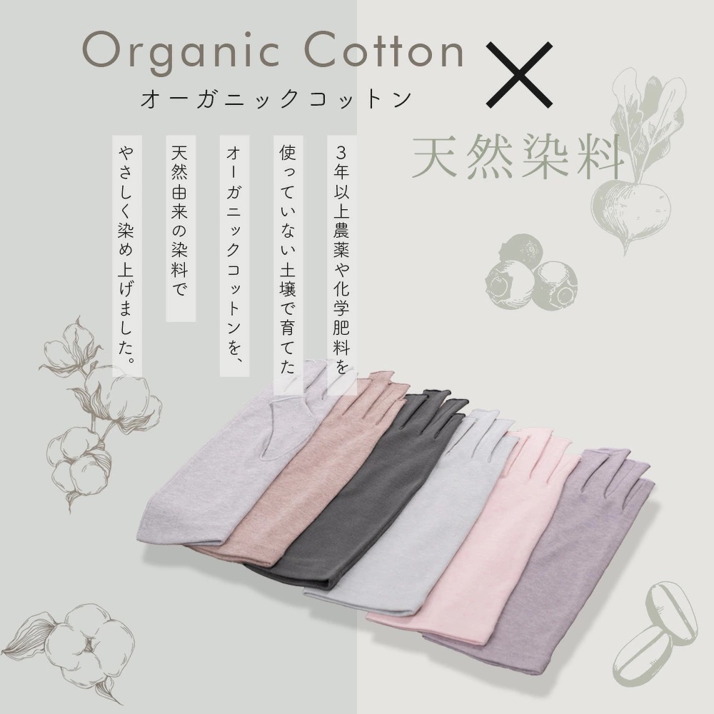 3年以上農薬や化学肥料を使用していない農地で有機栽培された綿花=オーガニックコットンを使用した肌触りのとてもよい手袋です。