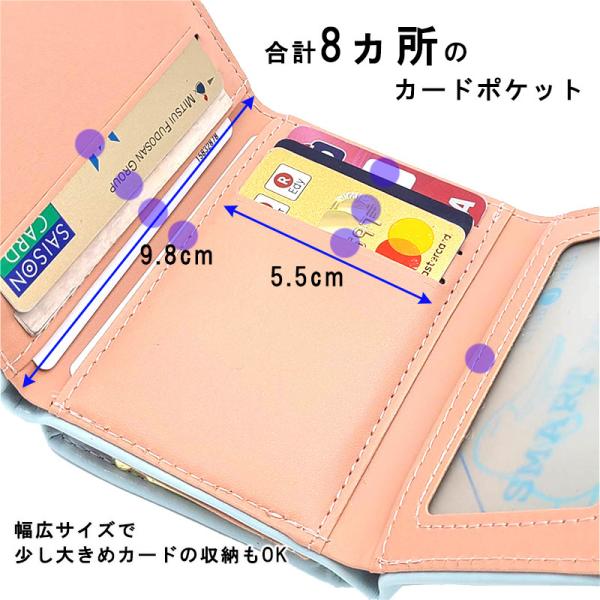 ハートのゴールド金具とパール調モチーフがアクセントになった女子力UP間違いなしの三つ折り財布。お札入れ×1,がま口小銭入れ×1,カードポケット×8ヵ所と満足の収納力。カードポケットに定期やicカードを入れておくと、カードの出し入れなくそのままピタッとタッチができて便利。カードポケットの背面にも収納スペースがあるのでコンパクトながらにたくさん収納でき、またお札入れも幅広なので整理しやすい。可愛いパステルカラーで取り揃えたオシャレ財布です。