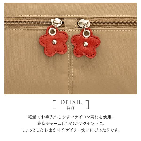 コロンとした丸みのあるフォルムに、愛らしい花型のファスナーチャームをあしらった、大人可愛いナイロンショルダーバッグです。
