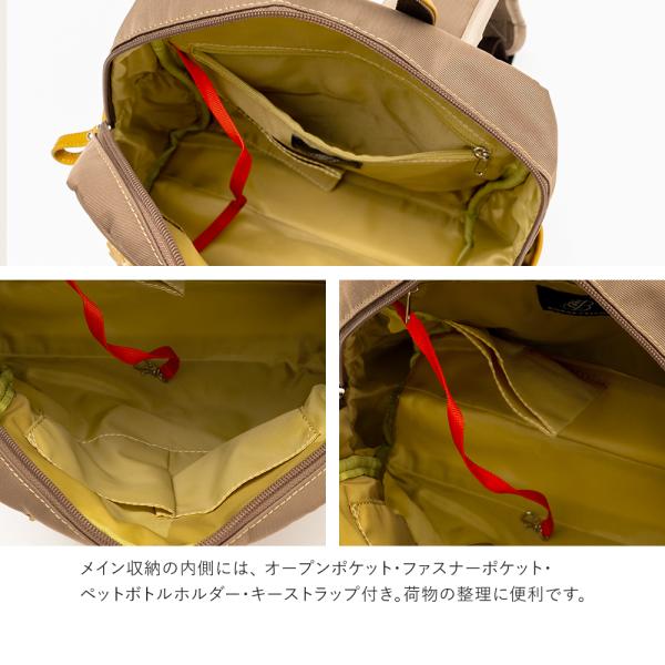 本体内側:オープンポケット×2、ファスナーポケット×1、ペットボトルホルダー×1、キーストラップ×1