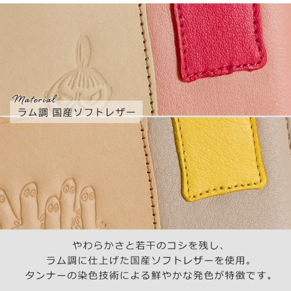 ムーミン、スナフキン、リトルミイ、ニョロニョロが型押しされた本革を使用した