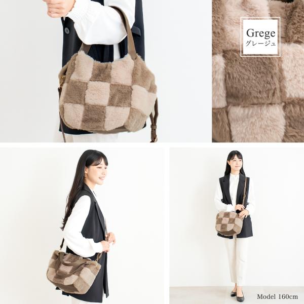 <軽量 フェイクファー ブロック チェック 2wayショルダー トートバッグ>