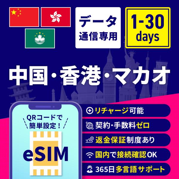 eSIM 中国 香港 マカオ 中国eSIM 香港eSIM マカオeSIM 中国用eSIM 香港用eSIM マカオ用eSIM 3日間 5日間 7日間 10日間 15日間 安心サポート リチャージ可能
