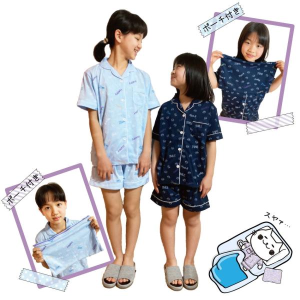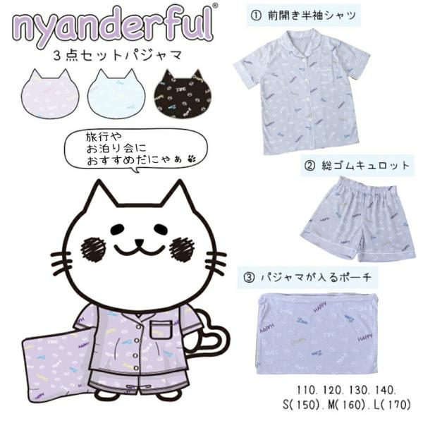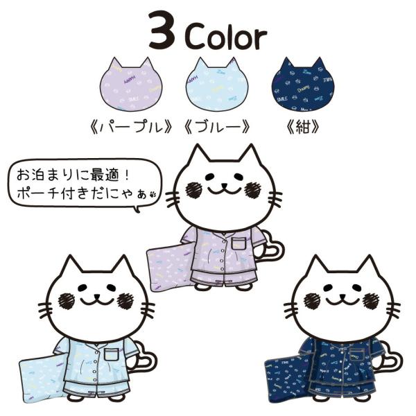 nyanderful 半袖パジャマ 3点セット 収納ポーチ付き 56511 キッズ 猫柄 110 120 130 140 150 160 170 パープル 紺 ブルー