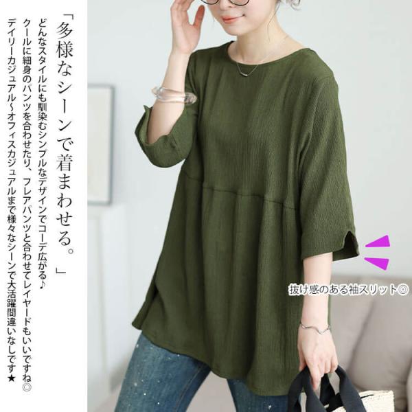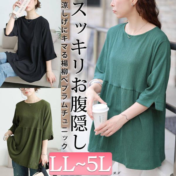 大きいサイズ レディース チュニック 5分袖 ロング ペプラム フレア 楊柳 伸縮 夏コーデ 夏 秋 春 LL 2L 3L 4L 5L ブラック 黒 カーキ グリーン 体型カバー