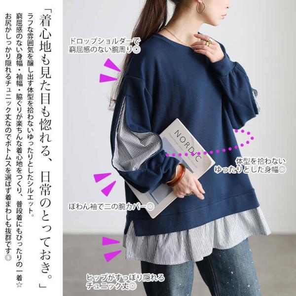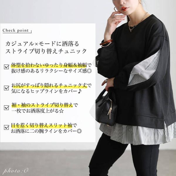 大きいサイズ レディース チュニック ストライプ切り替えスリット袖チュニック 長袖 ロング ドッキング フェイクレイヤード ストライプ柄 シャツ フリル スリット袖 スウェット ストレッチ 冬新作 秋服 冬服 春服 LL 2L 3L 4L 5L ブラック 黒 ネイビー ゴールドジャパン