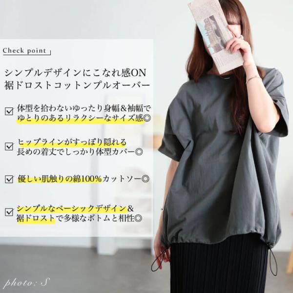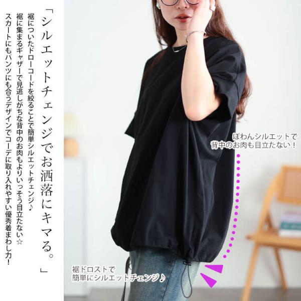 大きいサイズ レディース トップス カットソー Tシャツ 裾ドロストコットンプルオーバー 半袖 5分袖 クルーネック ドルマン ドロスト バルーン ストレッチ 無地 春新作 春服 夏服 秋服 LL 2L 3L 4L 5L ブラック 黒 ホワイト 白 チャコール ブルーグレー ゴールドジャパン
