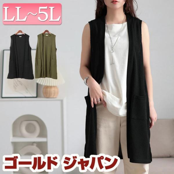 大きいサイズ レディース ベスト ジレ カーディガン ロング ポケット 畦編み ストレッチ スリット 無地 春コーデ 春 夏 秋 LL 2L 3L 4L 5L ブラック 黒 カーキ