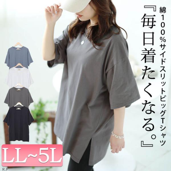 大きいサイズ レディース トップス Tシャツ 5分袖 無地 スリット 丸首 春コーデ 春 夏 秋 LL 2L 3L 4L 5L ブラック 黒 ホワイト 白 チャコール ブルーグレー