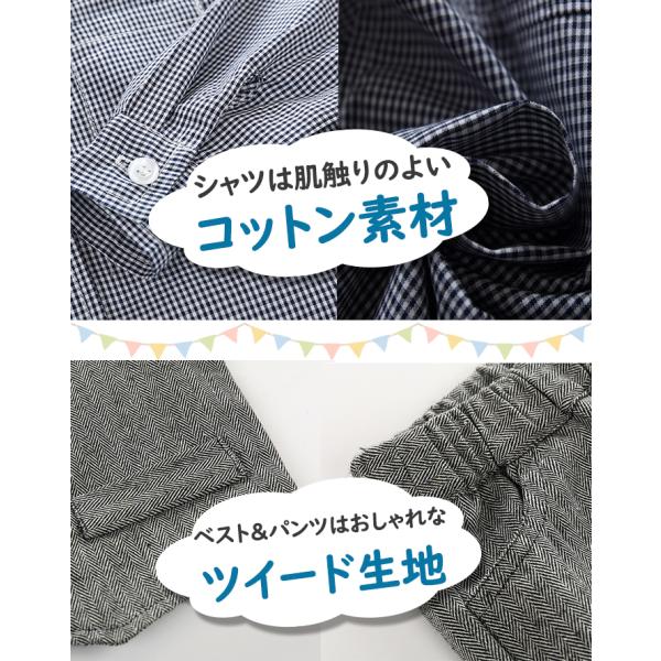 ツイードのベストとズボンにネイビーのチェックブラウスのベビースーツです。